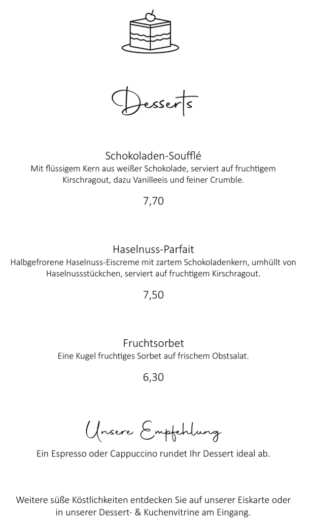 Seien Sie unser Gast zum Essen, zum Trinken oder für Kaffee, Eis oder leckeren Kuchen. Auf unserer Speisekarte finden Sie eine abwechslungsreiche, frische Küche mit regionalen und internationalen Gerichten. Besonders empfehlen möchten wir Ihnen unsere Fisch- und Wildgerichte, deren Zutaten wir ausschließlich von regionalen Lieferanten beziehen.